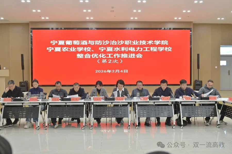 2026年2月4日,宁夏葡萄酒与防沙治沙职业技术学院、宁夏农业学校、宁夏水利电力工程学校三校联合召开第二次整合优化工作推进会,就落实自治区党委、政府关于高校优化布局的工作部署进行系统性安排。会议对整合优化实施方案进行了全面解读,标志着三校合并筹建新大学的进程进入实质性推进阶段。