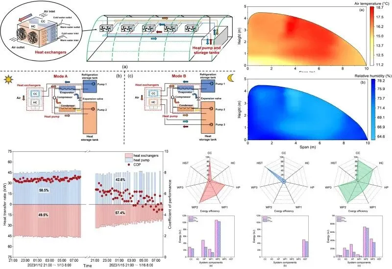 研究团队创制了双盘管表冷器与热泵耦合的新型空调系统(ACS-HEHP),通过白天收集低品位空气热能、夜间释放利用与冷凝除湿的闭环模式,匹配了温室热湿能量供需的时空差异。结果显示,ACS-HEHP可将室内最高气温控制在30℃以下,单周期最大收集空气热能551MJ;夜间平均气温提升6.6℃,能效比峰值达7.4,相对湿度维持在70.2%~72.9%的适宜范围,且单位面积除湿量满足温室生产需求。研究进一步揭示了系统各组件的㶲损失,多数组件㶲效率为76.1%~96.1%,具备良好的应用潜力。此外,研究也指出了热泵与水泵在低温条件下的优化空间。