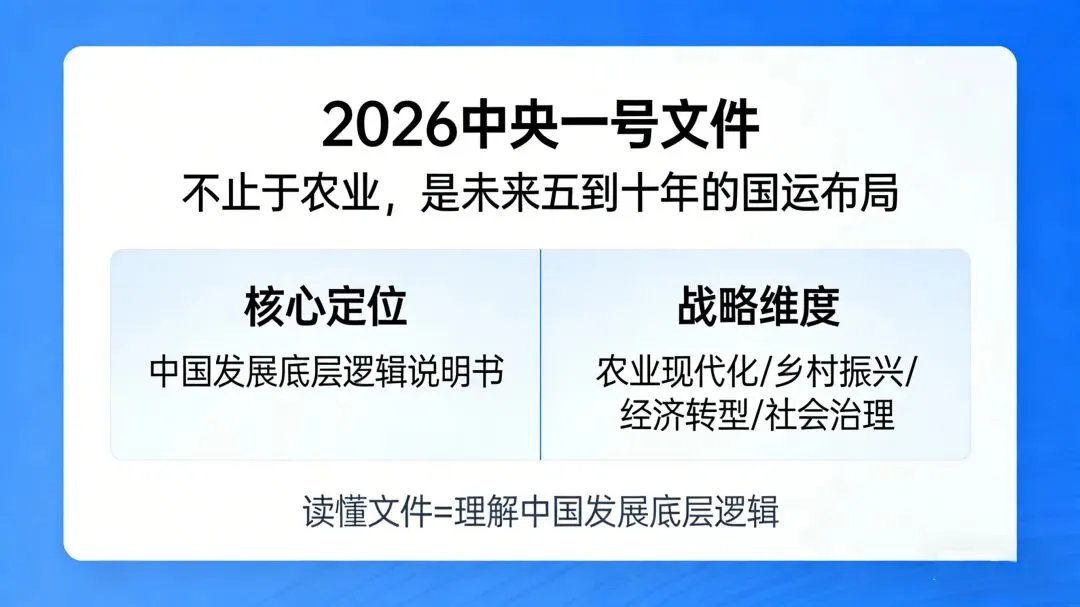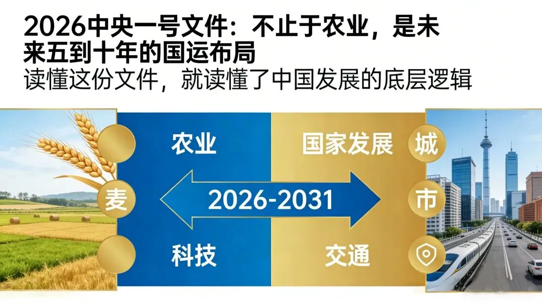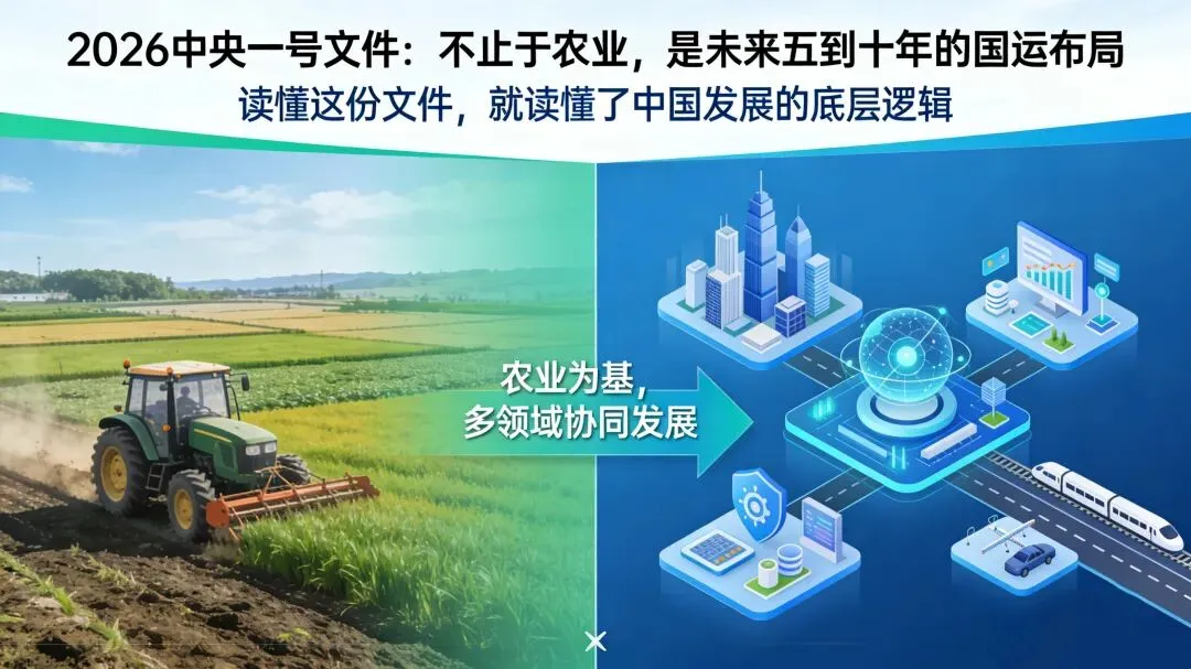 2026 年中央一号文件不仅是国家的战略布局,更是普通人、市场主体把握未来五到十年发展机遇的 “指南针”。这份文件清晰地指明了:过去二十年,中国的机会在城市、在互联网;未来五到十年,中国的机会在乡村、在县域、在农业现代化的赛道上。
