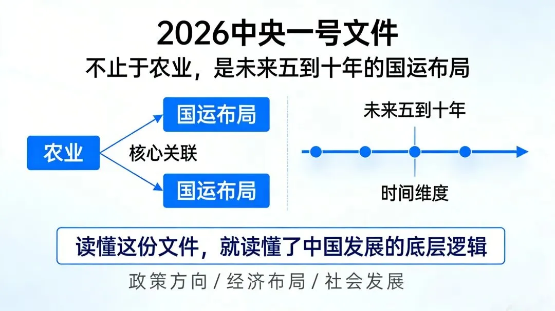提到中央一号文件,很多人的第一反应是 “和农业相关,与我无关”。但 2026 年这份恰逢 “十五五” 开局的一号文件,彻底打破了这种固有认知。在中美博弈进入深水区、全球地缘政治风险从 “黑天鹅” 变为常态化 “灰犀牛”、全球供应链脆弱性凸显的时代背景下,这份文件早已超越了农业农村发展的单一范畴,成为国家构筑战略大后方、筑牢通胀防线、激活经济内循环的关键拼图。它不仅划定了农业农村现代化的路线图,更锚定了中国未来五到十年的发展根基,关乎国运走向,读懂它,便读懂了中国在复杂局势下的发展底层逻辑。