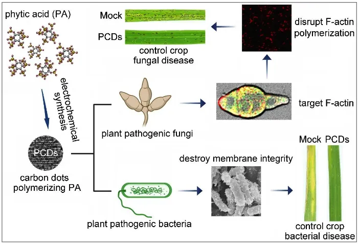 近日,云南农业大学王莫课题组在《Carbon》期刊上发表题为“Phytic acid-polymerized carbon dots efficiently inhibit various plant pathogens growth and function as a protective agent for controlling crop diseases”的研究成果。云南农业大学访问学者(苏州大学基础医学与生物科学学院)黄健副教授、福建农林大学已毕业博士研究生曹莹莹和已毕业硕士研究生李文燕为该论文的共同第一作者;云南农业大学王莫教授、苏州大学康振辉教授和福建农林大学李亚副教授为该论文的共同通讯作者。研究团队利用电解方式创制植酸聚合的碳点纳米材料(PCDs)。PCDs颗粒直径主要分布在2~4纳米,内部具有典型的石墨烯片层结构。与同浓度的植酸溶液相比,150 μg/mL的PCDs水溶液对于各种作物病原真菌生长的抑制率近乎达到100%。PCDs在488 nm的激发光下可以发出绿色荧光,这一光学特性为解析其抑菌活性的作用靶标奠定基础。研究团队利用PCDs处理转化各亚细胞结构分子荧光标记的稻瘟菌株,结果发现PCDs特异靶标稻瘟菌的F-actin,并在体外对于聚合的actin filament具有极强的解聚作用。利用PCDs处理转化Lifeact-RFP(F-actin荧光标记)的稻瘟菌株后持续观察发现,在处理3小时后PCDs在稻瘟菌菌丝细胞中可以被观测到与F-actin共定位,同时稻瘟菌菌丝也开始出现细胞极性的缺陷;当处理到15小时后,菌丝细胞发生严重的去极性化,细胞膨胀成球状并发生破裂。上述研究结果表明,PCDs渗透进入病原真菌细胞内,通过靶标F-actin,使actin filament发生解聚,进而破坏细胞极性达到抑制植物病原真菌生长的效果。研究人员推测,PCDs的高金属离子螯合活性可与actin蛋白竞争夺取结合在F-actin上的Ca2+和Mg2+等阳离子,进而促使actin filament解聚,破坏真菌细胞极性生长。进一步研究发现,75 μg/mL的PCDs对于各种作物病原细菌生长的抑制率近乎达到100%,而同浓度的植酸溶液的抑制率仅为20%左右。通过扫描电镜观察发现,利用75 μg/mL的PCDs处理水稻白叶枯菌24小时后,菌细胞膜出现异常褶皱;当处理到48小时后,白叶枯菌细胞表面产生外向延伸的凸起并伴随细胞膜破裂和菌细胞死亡。研究人员推测,PCDs在渗透进入细菌细胞过程中,对其表面金属离子的螯合作用破坏了细菌细胞膜的完整性,进而起到抑制细菌生长的作用。