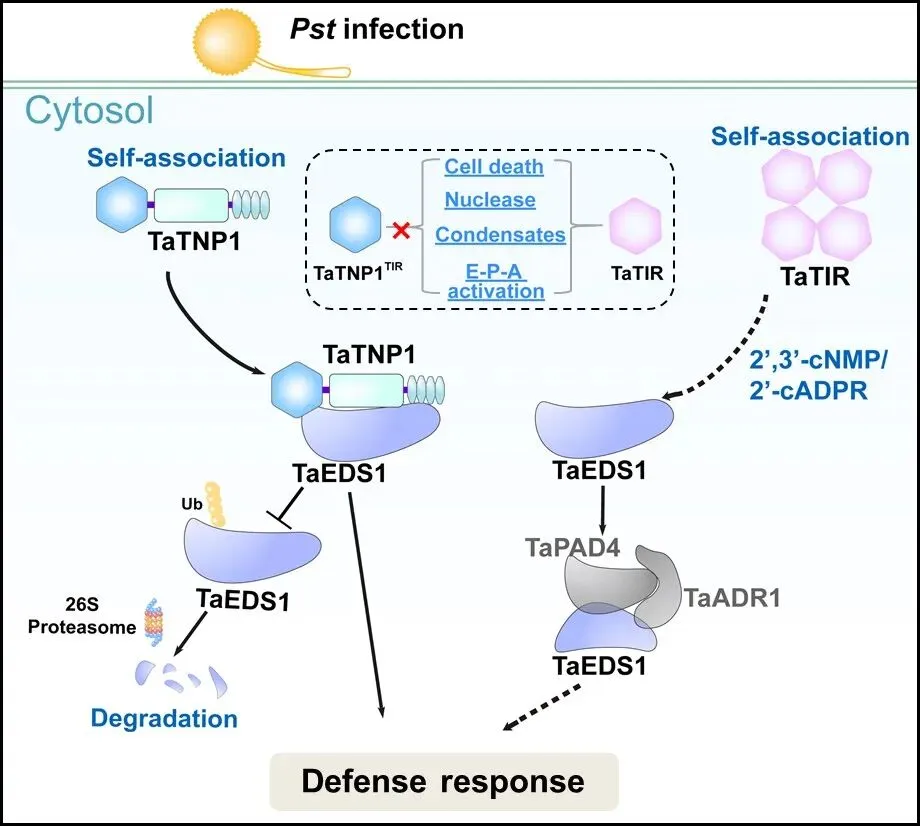 该研究从小麦编码TIR蛋白的候选基因中鉴定到参与小麦对条锈菌抗性的具有TIR-NBS-TPR结构域的基因TaTNP1。为明确TaTNP1的生物学功能,创制了TaTNP1的稳定过表达与基因编辑材料,从遗传水平证明了其在小麦对条锈菌免疫反应中的正调控功能。研究发现,小麦TIR-only蛋白TaTIR通过常规的催化活性激活TaEDS1依赖的细胞死亡过程;TaTNP1的TIR结构域因BB-loop基序的变异与催化半胱氨酸的缺失,不具备引起细胞死亡、核酸酶活性、相分离等TIR蛋白典型生物学功能。TaTNP1的TIR结构域仅具有微弱的NADase活性,无法直接激活EDS1-PAD4-ADR1复合体。TaTNP1可通过寡聚化的方式与TaEDS1直接互作,并通过抑制TaEDS1的泛素化降解过程维持其稳态。