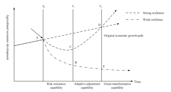 对于适应调整能力,图中主要体现了经济在达到最大收缩后的反弹强度。在时间t1,经济进入复苏阶段。由于适应韧性不足,新的增长路径BE未能超越原有路径的正增长率,反而低于该增长率。随后,BE路径持续落后于原有增长路径,这表明“韧性”较弱,经济面临预期的永久性损失。相反,新的增长路径CD表现出更强的适应能力,其经济增长率超过了原有水平。经济的“韧性”强劲,能够实现快速增长和复苏,在点D恢复到原有增长路径。