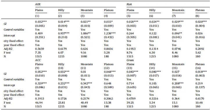 再次,地理特征和交通网络差异导致GI产品对AER的影响存在显著异质性。平原、丘陵和高原地区的提升作用更为显著,而山区的影响虽为正,但不显著,这可能是由于山区交通不便、生产效率较低。在交通网络发达的城市,GI产品对AER、风险和绿色的提升作用更为显著,但对农业先进能力的调节作用不显著,这表明交通网络密度并非影响农业先进能力的主要因素。