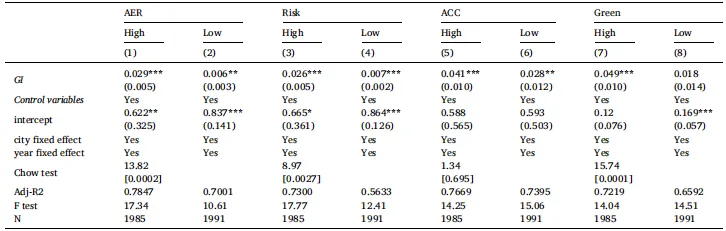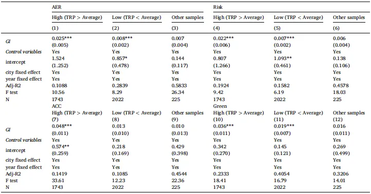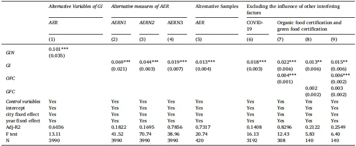 第五,基于城市传播能力的异质性分析显示,传播能力较强的城市中,GI产品对AER、风险、农业先进能力和绿色的影响更为显著。这表明旅游等传播渠道通过提升消费者对GI产品“原产地声誉”的认知,放大了其经济效应。