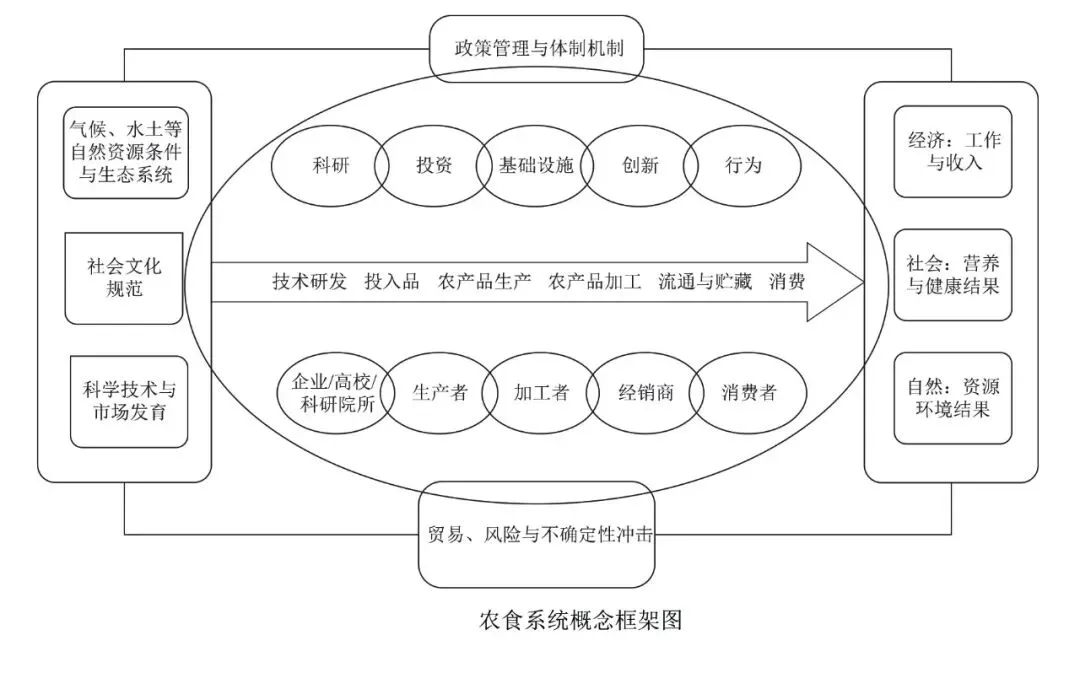 农食系统(agri-food system)或者“农业与食物系统”,是指“农业与食物价值链上的所有活动和要素及其交互关系的总和”。农业生产活动中最大的部分主要是食物生产活动,因此农业与食物系统又常称为食物系统(food system)。需要指出的是,农业不仅仅生产食物,按照产品是否可食用,农业大致可分为生产食用农产品和非食用农产品两大类;食用农产品又可进一步细分为粮食(我国统计中将粮食分为谷物、豆类和薯类三大类)和其他食用农产品(如食用油、糖、瓜果等);非食用农产品包括棉花、饲草和花卉等。因此,“农食系统”和“食物系统”两者还是有所区别。