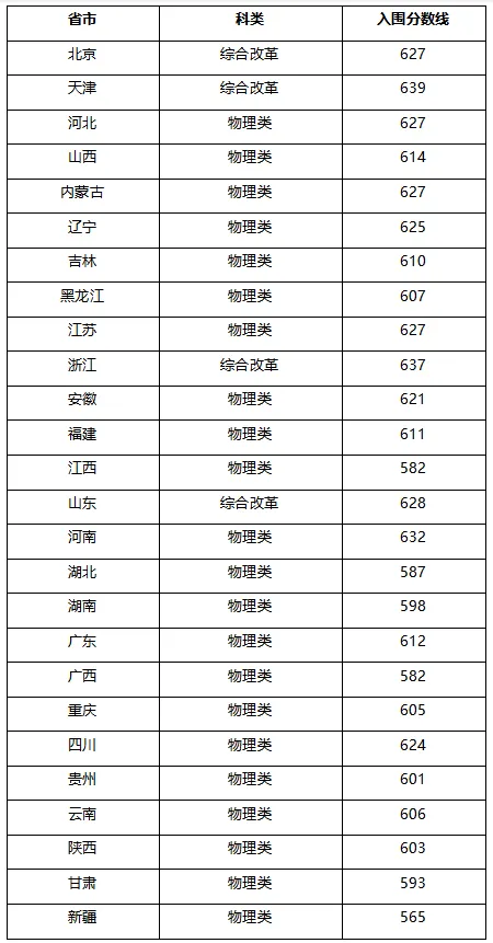 中国农业大学2025年强基计划各省第一类考生最低入围分数线分别为: