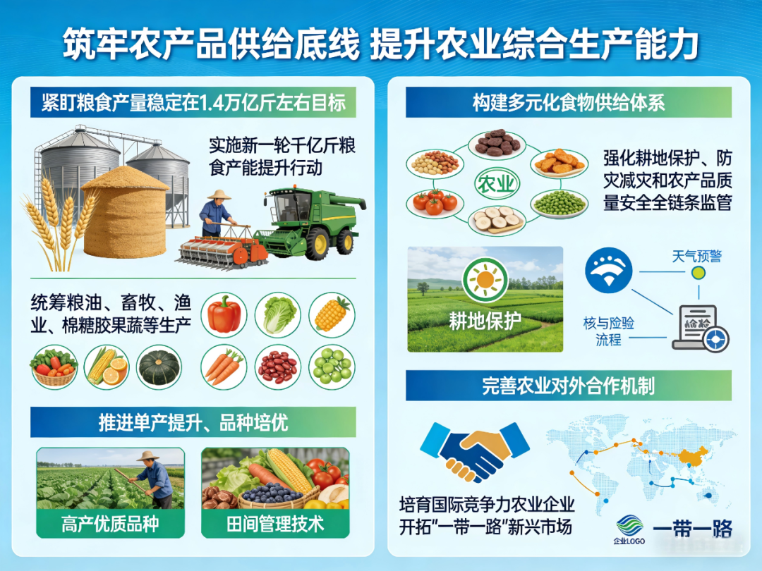 紧盯粮食产量稳定在 1.4 万亿斤左右的目标,实施新一轮千亿斤粮食产能提升行动,统筹粮油、畜牧、渔业、棉糖胶果蔬等生产,推进单产提升、品种培优。同时构建多元化食物供给体系,强化耕地保护、防灾减灾和农产品质量安全全链条监管,完善农业对外合作机制,培育国际竞争力农业企业,开拓 “一带一路” 新兴市场。