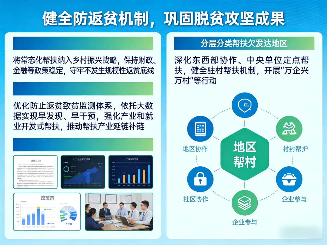 将常态化帮扶纳入乡村振兴战略,保持财政、金融等政策稳定,守牢不发生规模性返贫底线。优化防止返贫致贫监测体系,依托大数据实现早发现、早干预,强化产业和就业开发式帮扶,推动帮扶产业延链补链。分层分类帮扶欠发达地区,深化东西部协作、中央单位定点帮扶,健全驻村帮扶机制,开展 “万企兴万村” 等行动。