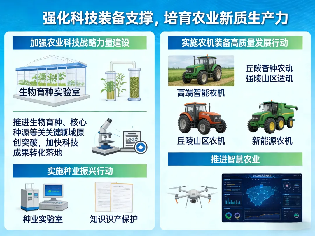 加强农业科技战略力量建设,推进生物育种、核心种源等关键领域原创突破,加快科技成果转化落地。深入实施种业振兴行动,推进生物育种产业化,强化种业知识产权保护。实施农机装备高质量发展行动,研发高端智能、丘陵山区适用农机和新能源农机,同时大力推进智慧农业,拓展人工智能、无人机等应用场景,建设农业农村大数据平台。