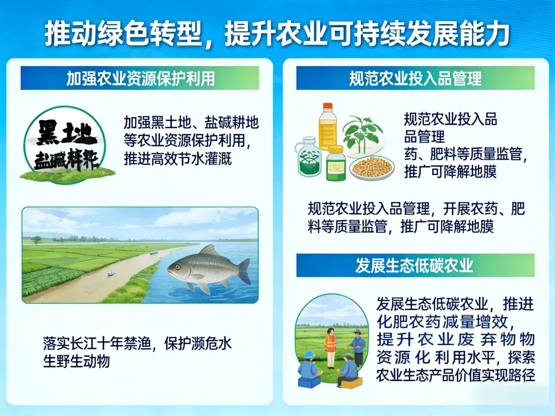 加强黑土地、盐碱耕地等农业资源保护利用,推进高效节水灌溉,落实长江十年禁渔,保护濒危水生野生动物。规范农业投入品管理,开展农药、肥料等质量监管,推广可降解地膜。发展生态低碳农业,推进化肥农药减量增效,提升农业废弃物资源化利用水平,探索农业生态产品价值实现路径。