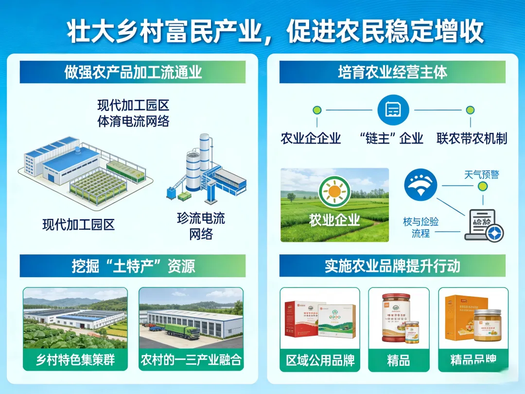 做强农产品加工流通业,打造现代加工园区、优化冷链物流网络;挖掘 “土特产” 资源,推动乡村特色产业差异化、集群化发展,融合农村一二三产业,培育休闲旅游、非遗工坊等新业态。分行业培育农业龙头企业和 “链主” 企业,完善联农带农机制,实施农业品牌提升行动,打造区域公用品牌和精品品牌。