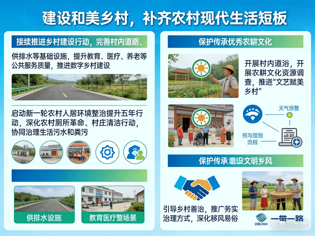 接续推进乡村建设行动,完善村内道路、供排水等基础设施,提升教育、医疗、养老等公共服务质量,推进数字乡村建设。启动新一轮农村人居环境整治提升五年行动,深化农村厕所革命、村庄清洁行动,协同治理生活污水和粪污。保护传承优秀农耕文化,开展农耕文化资源调查,推进 “文艺赋美乡村”;引导乡村善治,推广务实治理方式,深化移风易俗,建设文明乡风。
