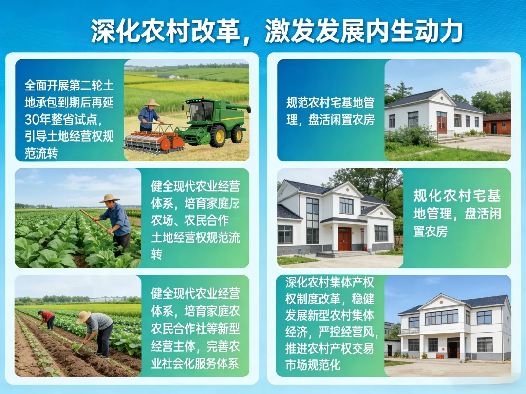 全面开展第二轮土地承包到期后再延长 30 年整省试点,引导土地经营权规范流转。健全现代农业经营体系,培育家庭农场、农民合作社等新型经营主体,完善农业社会化服务体系。规范农村宅基地管理,盘活闲置农房;深化农村集体产权制度改革,稳健发展新型农村集体经济,严控经营风险,推进农村产权交易市场规范化。