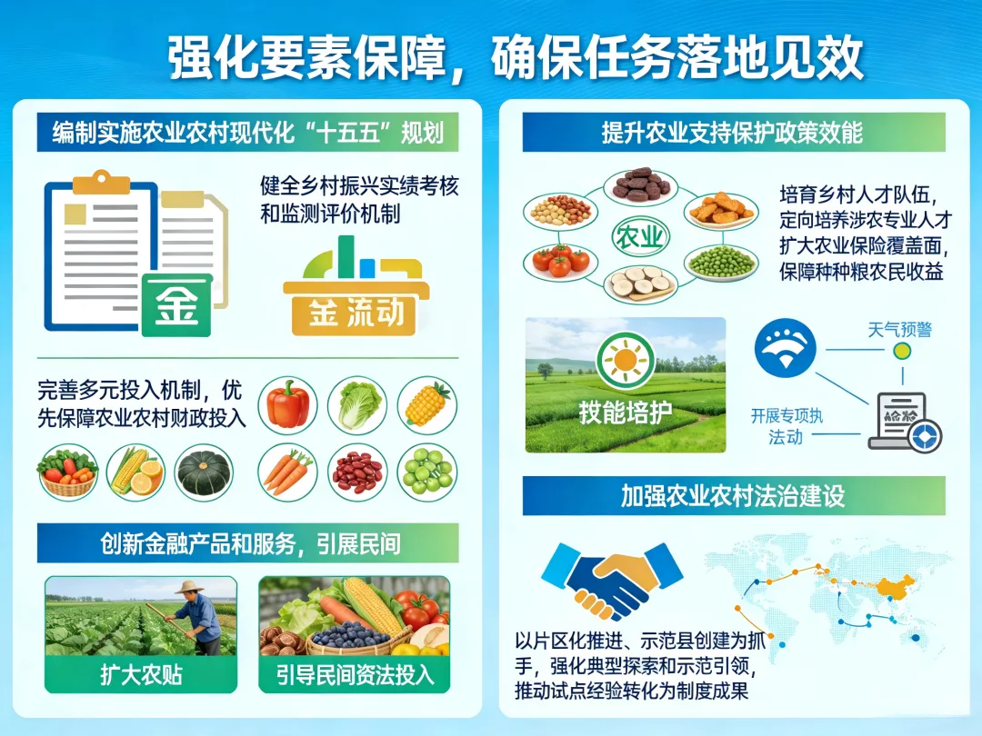 编制实施农业农村现代化 “十五五” 规划,健全乡村振兴实绩考核和监测评价机制。完善多元投入机制,优先保障农业农村财政投入,创新金融产品和服务,引导民间资本投入。提升农业支持保护政策效能,稳定粮食补贴、扩大农业保险覆盖面,保障种粮农民收益。培育乡村人才队伍,定向培养涉农专业人才,强化数智技能培训;加强农业农村法治建设,完善法律法规体系,开展专项执法行动。同时以片区化推进、示范县创建为抓手,强化典型探索和示范引领,推动试点经验转化为制度成果。