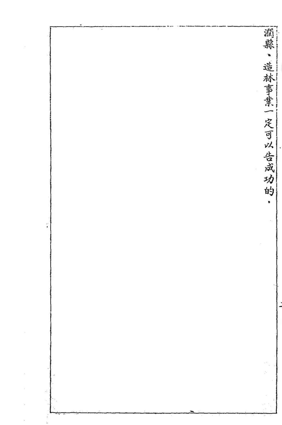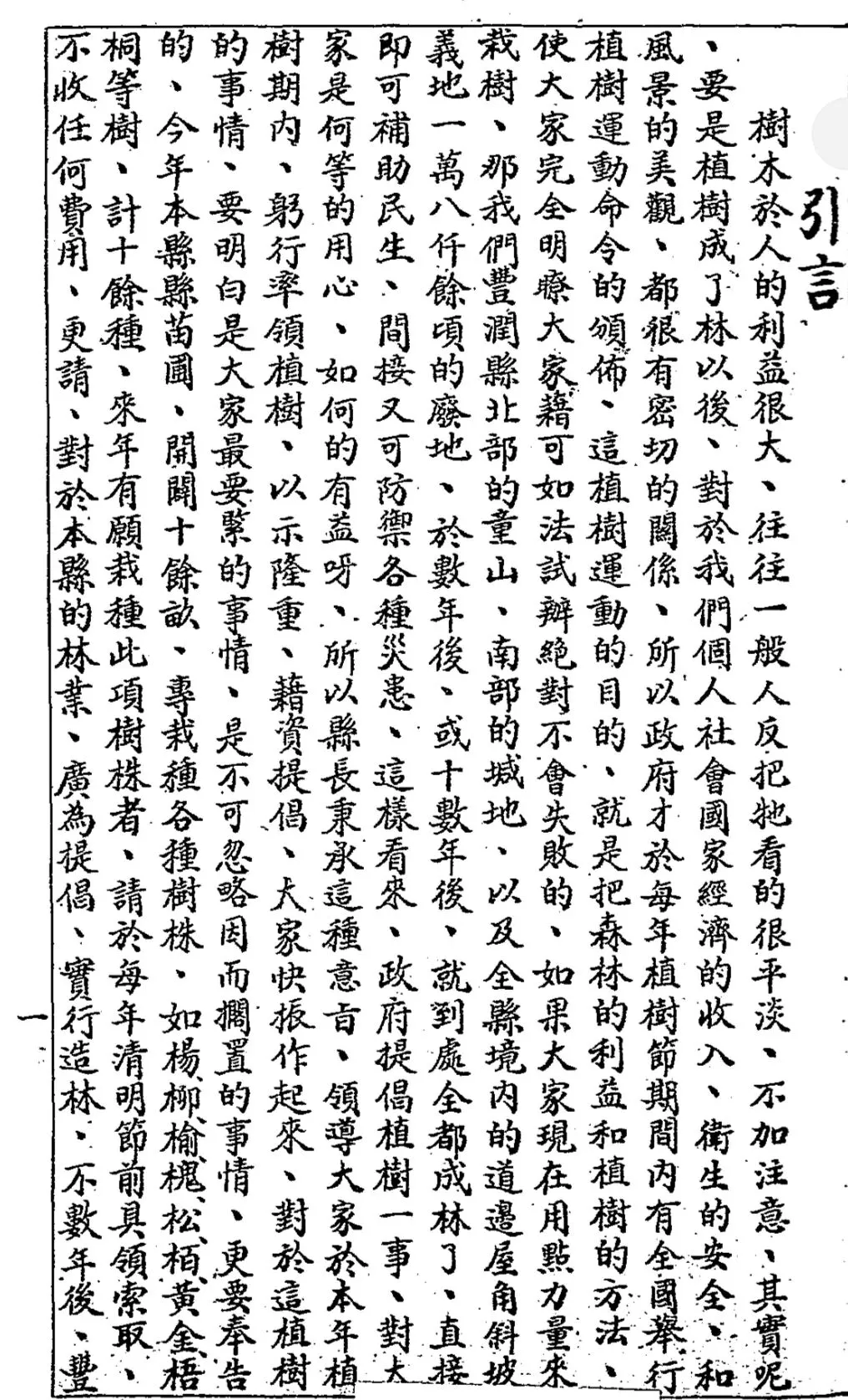 樹木於人的利益很大、往往一般人反把牠看的很平淡、不加注意、其實呢、要是植樹成了林以後、對於我們個人社會國家經濟的收入、衛生的安全、和風景的美觀、都很有密切的闗係、所以政府才於每年植樹節期間内有全國舉行植樹運動命令的頒佈、這植樹運動的目的、就是把森林的利益和植樹的方法、使大家完全明療大家藉可如法試瓣絕對不會失敗的、如果大家現在用點力量來栽樹、那我們豐潤縣北部的童山、南部的城地、以及全縣境内的道邊屋角斜坡義地一萬八仟餘頃的廢地、於數年後、或十數年後、就到處全都成林了、直接即可補助民生、間接又可防禦各種災患、這樣看來、政府提倡植樹一事、對大家是何等的用心、如何的有益呀、所以縣長秉承這種意旨、領導大家於本年植樹期内、躬行率領植樹、以示隆重、藉資提倡、大家快振作起來、對於這植樹的事情、要明白是大家最要□的事情、是不可忽略因而擱置的事情、更要奉告的、今年本縣縣苗圎、開闢十餘畝、專栽種各種樹株、如楊柳榆槐松栢黄金梧桐等樹、計十餘種、來年有願栽種此項樹株者、請於每年清明節前具領索取、不收任何費用、更請、對於本縣的林業、廣為提倡、實行造林、不數年後、豐潤縣、造林事業一定可以告成功的。