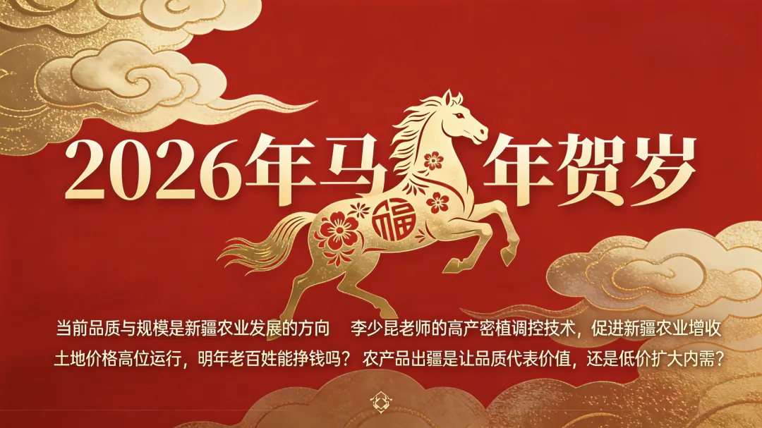 丙午马年将至,马在中华农耕文明中始终占据着特殊而重要的地位。作为农耕时代的核心生产伙伴,马是耕耘沃野、转运粮秣、助力农桑的得力干将,承载着勤耕不辍、实干奋进、五谷丰登的农耕精神,是农业发展中“耕耘者”与“丰收者”的精神图腾。农俗之中,马年素有“龙马耕春,岁稔年丰”的吉庆年景寓意,象征着风调雨顺、农作顺遂,是农业提质、产业奋进的黄金之年。值此辞旧迎新之际,我们期盼新农人耕耘有获、农企发展有方;更期盼新疆农业产业化与社会化服务迈上新阶,广袤沃野结出累累硕果!谨此向新疆广大农友、农业同仁致以最诚挚的新春祝福,愿岁岁丰稔,万事顺遂,农运亨通!