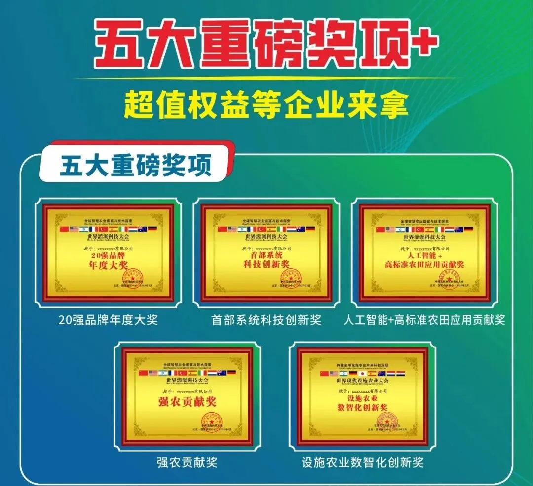 展会设立的“世界灌溉科技大会20强品牌年度大奖”、“强农贡献奖”、“首部系统科技创新奖”、“人工智能+高标准农田应用贡献奖” 等一系列权威奖项,已成为行业创新的重要风向标。