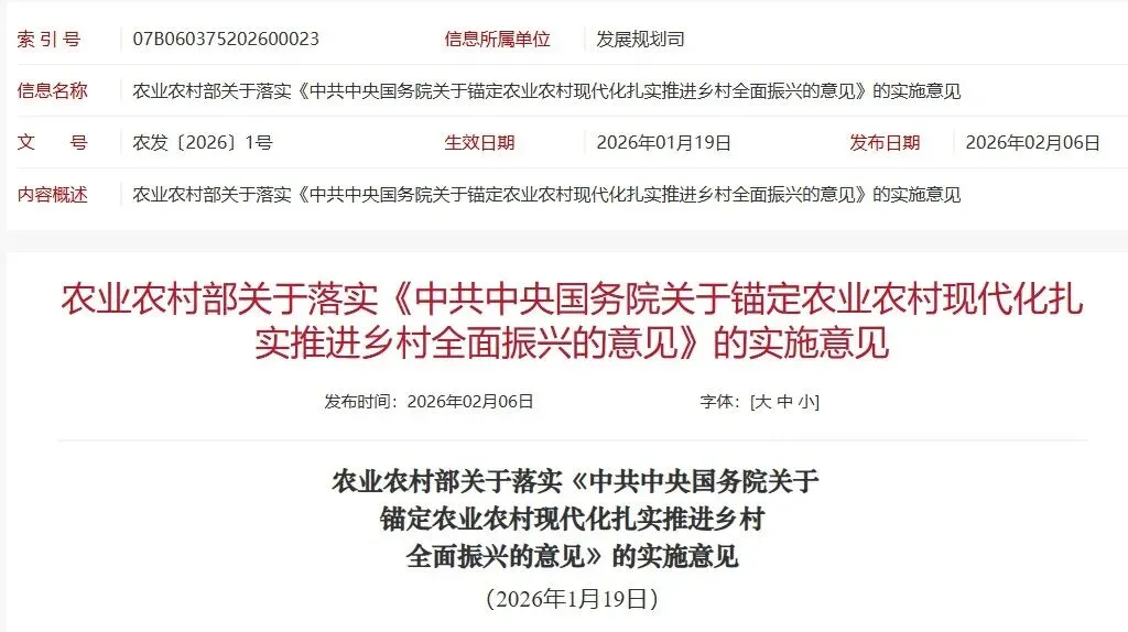 为深入贯彻2026年中央一号文件精神,2月6日,农业农村部印发《关于落实〈中共中央 国务院关于锚定农业农村现代化、扎实推进乡村全面振兴的意见〉的实施意见》(以下简称《实施意见》),从8个方面提出40项举措,旨在推动“三农”工作实现新发展新提升。