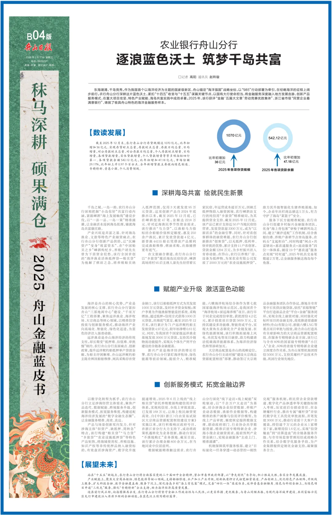 远洋渔业是舟山海洋经济的传统支柱,却长期受“抵押难、估值难、审批慢”制约。农行舟山分行直面痛点、创新政策,提升远洋鱿钓船抵押单户贷款金额,为船主纾困解难。舟山远洋鱿钓船主陈舟辉因船舶维修、网具采购存在资金缺口,该行以船舶抵押方式为其发放1000 万元贷款,及时补齐资金短板;客户李勇为升级渔船智能监控系统、采购燃油,通过抵押+信用方式获得1000万元贷款,出海底气更足。截至2025年12月末,该行累计为71户远洋鱿钓船主发放贷款4.97亿元,较年初净增0.61亿元。同时,为我国首个国家级远洋渔业基地发放3000万元贷款,支持其冷链物流功能提升,实现从个体生产到平台建设的全链条金融覆盖。