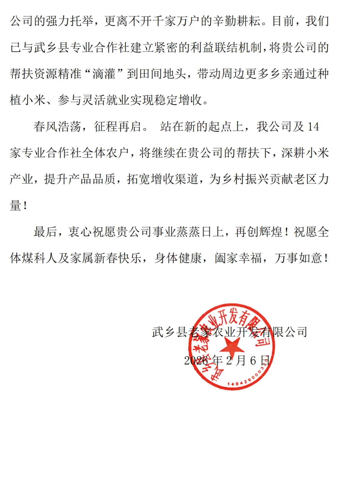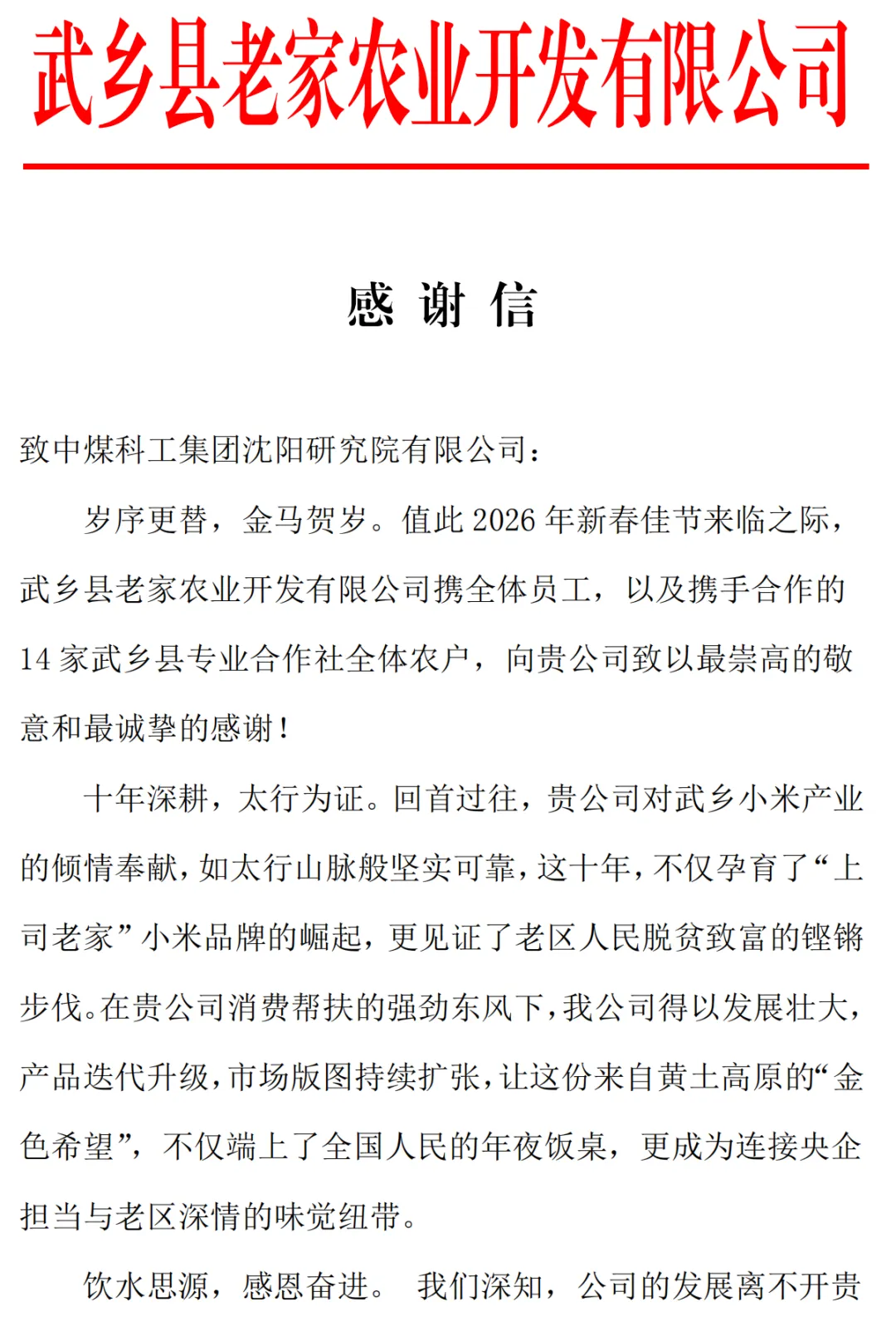 近日,沈阳研究院收到来自武乡县老家农业开发有限公司的感谢信,信中对沈阳研究院长期以来定点帮扶、持续采购老区农特产品、助力乡村振兴的务实举措,表示衷心感谢与崇高敬意。