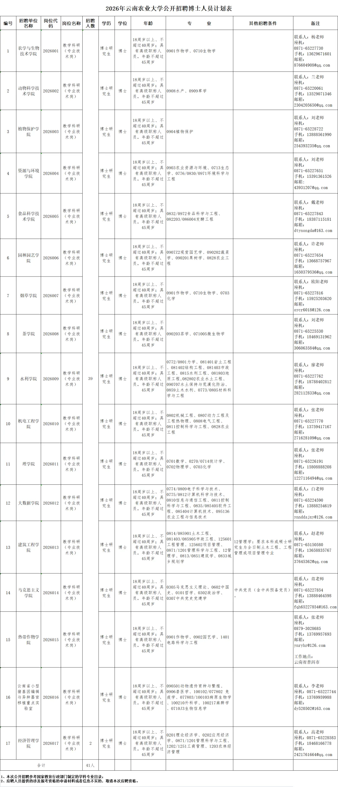 云南农业大学共公开招聘博士人员41名。具体招聘岗位及招聘条件,详见《2026年云南农业大学公开招聘博士人员计划表》(附件1)。