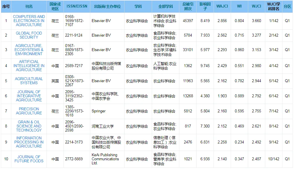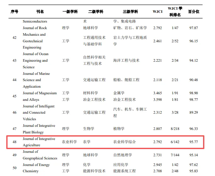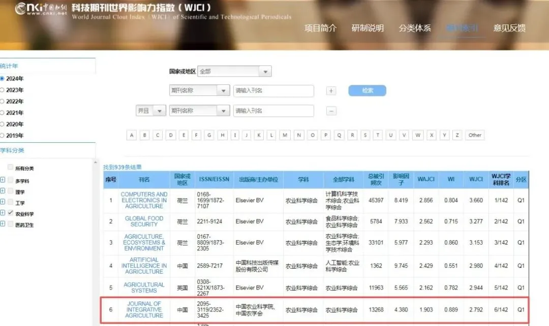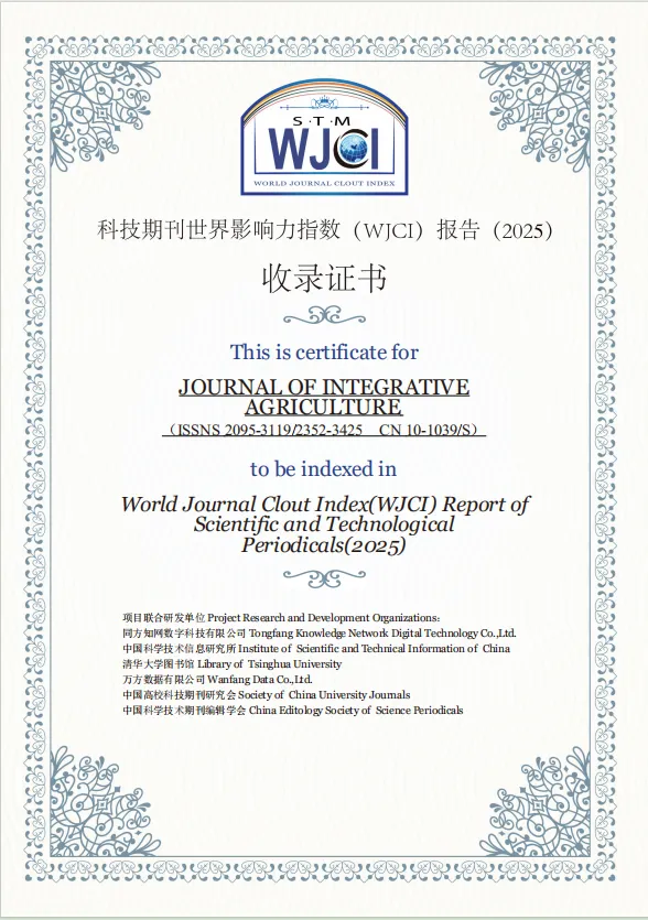 近日,中国科协发布《科技期刊世界影响力指数(WJCI)报告》(以下简称《WJCI报告》)2025版发布。Journal of Integrative Agriculture(《农业科学学报(英文)》, JIA) &《中国农业科学》两刊继续入选该报告。报告显示,全球农业科学综合领域共入选142 本期刊,其中JIA总被引频次13268,WJCI 2.792,位列第6;《中国农业科学》总被引频次13046, WJCI 1.855,位列第22。JIA &《中国农业科学》
