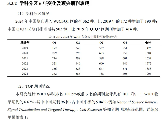 2025 版确定 WJCI 来源期刊共计 15274 种。其中英文期刊12056 种,非英语和混合语种期刊 3218 种。其中中国期刊(不包含中国香港、中国澳门和中国台湾,下同)1906种,英文刊 531 种、中文刊 1349 种,中英文混合语种期刊26 种。WJCI 全面统计了中外期刊的国内国际影响力,反映出我国科技期刊近几年的成长变化以及国际差距。WJCI 收录的中国期刊数量由 2020 版的1426 种,扩增至今年的1906种,其中英文期刊 531 种(比最初增加 269 种)、中文期刊1349 种(比最初增加174种)。中国期刊的各项评价指标节节攀升,今年总被引频次482.15 万次(比2020版增长了 1.08 倍)、刊均总被引频次 2530 次(比 2020 版增长 55.60%)、刊均影响因子2.434(比 2020 版增长了 1.20 倍)。今年 WJCI 学科排名位列Q1 区(前25%)的中国期刊有 362 种(比最初增加 190 种),Q1Q2(前 50%)期刊数超过10 种的三级学科达到31个,体现了我国科技期刊发展的优势学科分布。