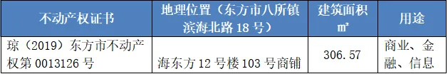 中国农业银行股份有限公司东丰县支行抵债资产位于海南省东方市八所镇滨海北路“海东方”一期小区12#楼103号商铺,所在楼层为一、二层,面积306.57平方米,建成时间为2015年,性质为商用房地产,小区配套底商,毛坯、空置,无损坏,未出租,无查封,无抵押,通水、通电;建筑结构;框架结构;外墙为涂料粉刷,建筑外观较好;层高约为3.9米,室内净高约为3.75米;防水、隔热、隔音通风、采光、日照均较好;产权清晰,东丰县支行单独所有,取得不动产登记证书。