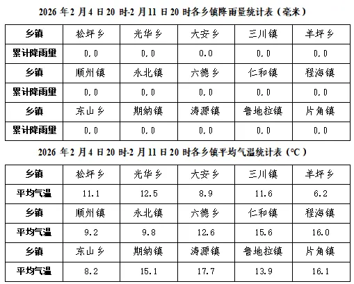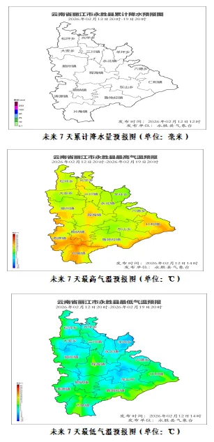 2026年2月4日20时至2月11日20时,永胜国家基本气象站无降水,较常年同期偏少1.6毫米;平均气温9.8℃,较常年同期偏高1.7℃。过去7天,总体气象条件适宜农事活动。二、未来7天天气趋势预测