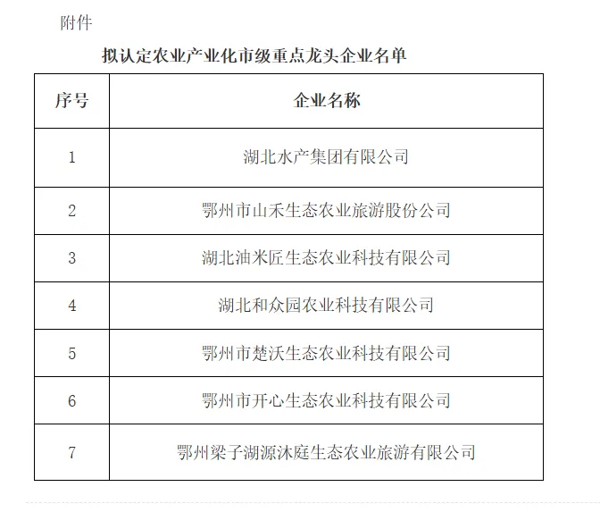 根据《鄂州市农业产业化市级重点龙头企业申报认定和监测管理办法》(鄂州农产办字〔2023〕1号)规定,鄂州市农业产业化经营领导小组办公室(鄂州市农业农村局)组织开展了2025年度农业产业化市级重点龙头企业认定和监测工作,经企业自愿申报、区级审核,征求市农业产业化经营领导小组成员单位意见,市农业农村局党组会研究通过,湖北水产集团有限公司等7家企业符合农业产业化市级重点龙头企业条件,拟认定为农业产业化市级重点龙头企业。现予以公示,公示期为5个工作日(2026年2月11日—24日)。