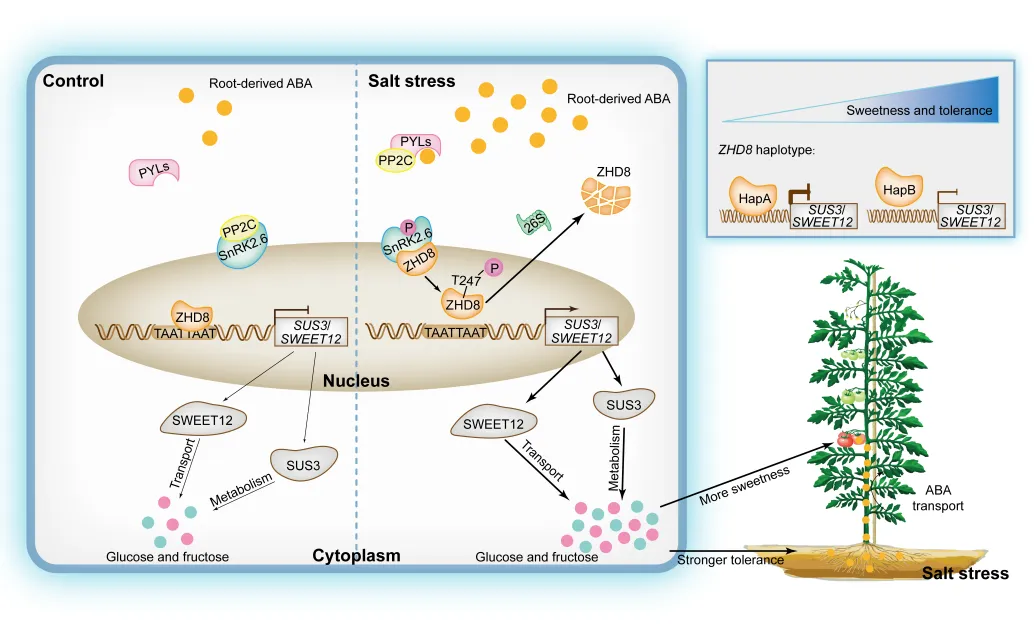 科学研究既要“顶天”,更要“立地”。该研究团队为了让成果更快应用于育种实践,通过分析了番茄驯化历程中的基因组数据,发现SlZHD8基因在番茄驯化过程中经历了人工选择,并存在4种主要单倍型。其中,单倍型B是一种“有益单倍型”——它与DNA的结合能力弱于常见的单倍型A,能适度解除对SlSUS3和SlWEET12的转录抑制,让果实更甜、抗盐性更强。遗憾的是,在番茄驯化过程中,单倍型B的频率逐渐降低,现代栽培品种中几乎难以找到。研究团队采用基因编辑和常规杂交技术从樱桃番茄中快速获取了单倍型B并用于番茄遗传改良,实现了盐碱胁迫下番茄抗性和品质协同提升的目的。