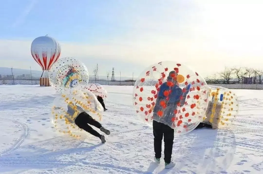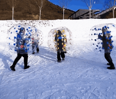 钻进透明球中,和小伙伴轻轻一撞,便滚作一团。在软绵绵的雪上摇摇晃晃,笑声和雪花一起飞扬,冬日的寒意就这样被撞散在清脆的笑声里。