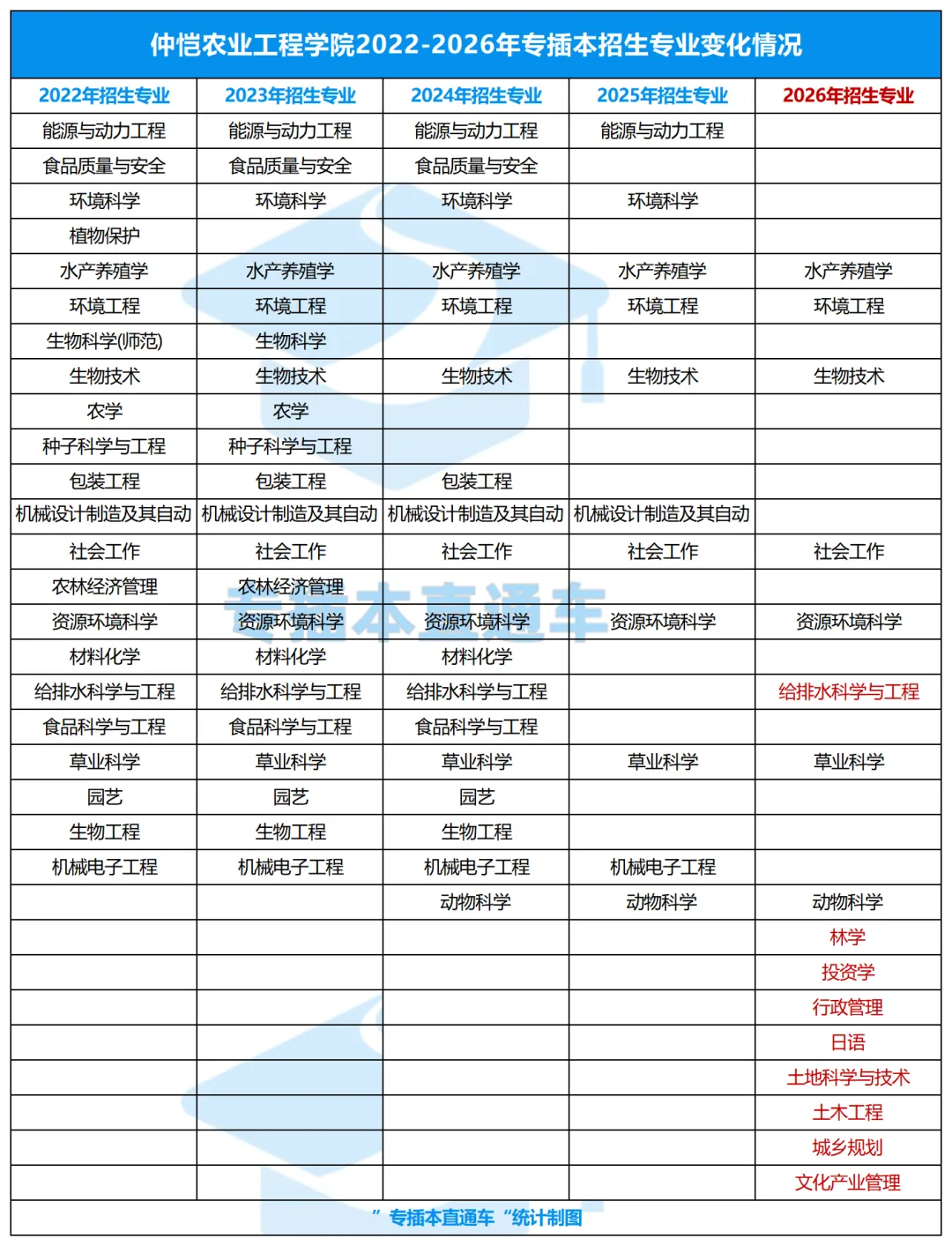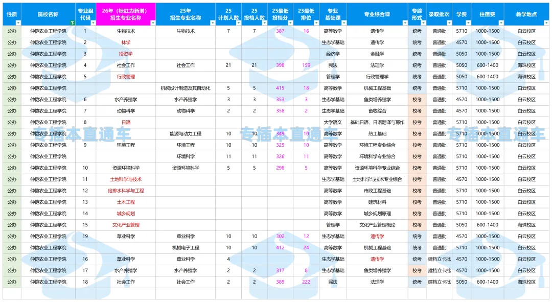 仲恺农业工程学院2026年普通专升本招生16个专业,新增“林学”“投资学”“行政管理”“日语”“土地科学与技术”“土木工程”“城乡规划”及“文化产业管理”等8个招生专业,“机械设计制造及其自动化”“能源与动力工程”“环境科学”及“机械电子工程”等4个2025年招生专业在2026年暂停招生。