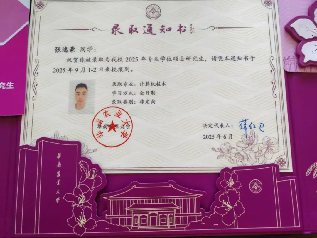 考研之路充满挑战,身边不时出现质疑的声音,但他始终相信自己的选择,通过不断调整学习方法、保持积极心态,最终在初试与复试中稳定发挥,成功被华南农业大学录取。这段经历让他深刻体会到,目标明确、持之以恒是走向成功的关键。