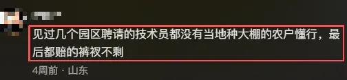 正因为过度依赖了技术员才导致了最后赔的底朝天,而且这样的事情并不是个例。一位网友说:见过几个园区聘请的技术人员都没有当地种大棚的种植户懂行,最后赔的裤衩都不剩了。