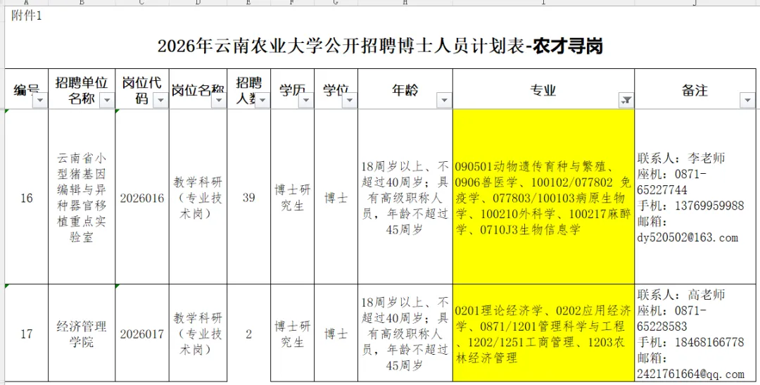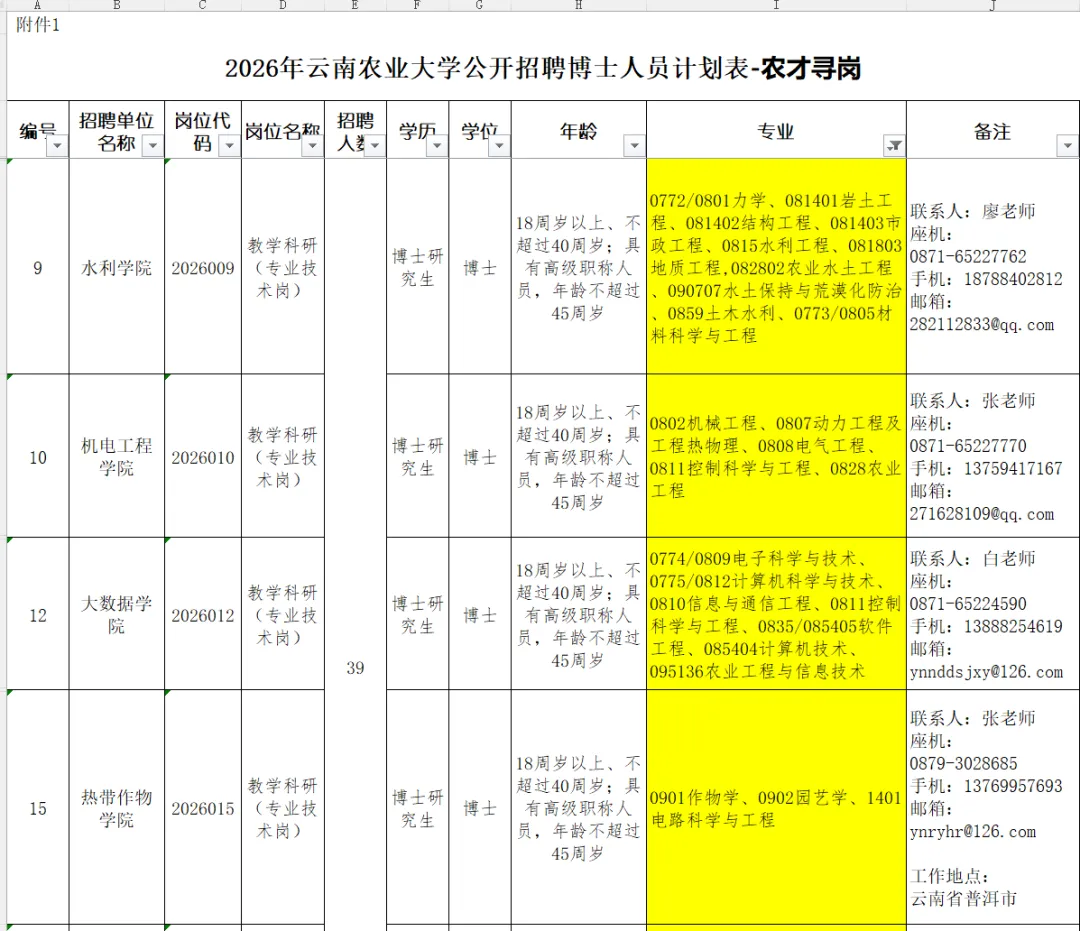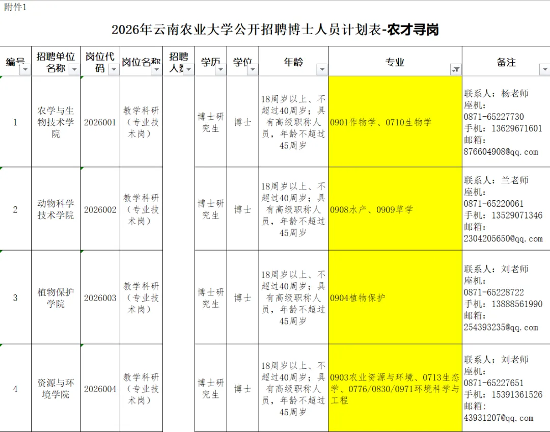 附件:1.2026年云南农业大学公开招聘博士人员计划表