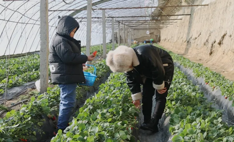 2月10日,在红星一场三连小杨草莓采摘园里,红彤彤的草莓吸引大批游客前来采摘。
