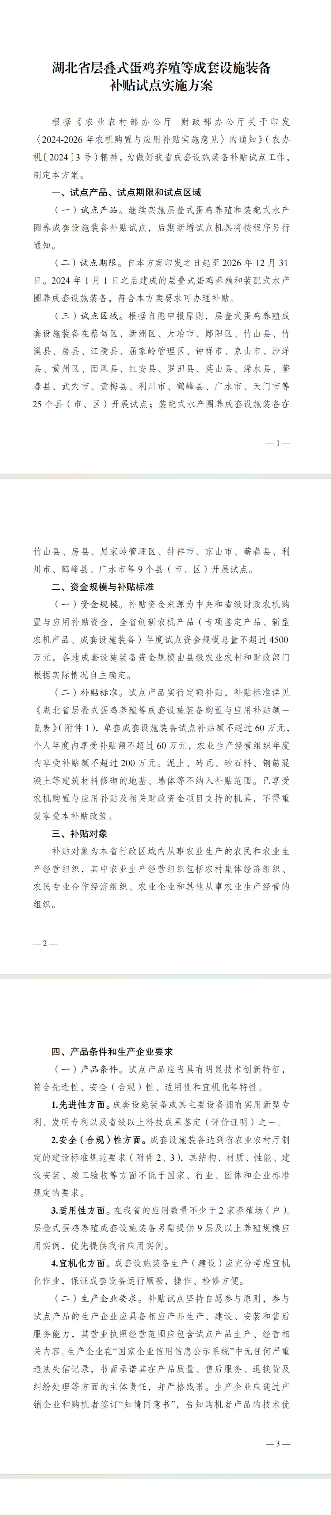 按照《农业农村部办公厅 财政部办公厅关于印发〈2024-2026年农机购置与应用补贴实施意见〉的通知》(农办机〔2024〕3号)和《湖北省农业农村厅 湖北省财政厅关于印发〈湖北省2024-2026年农机购置与应用补贴实施方案〉的通知》(鄂农发〔2024〕44号)要求,经商省财政厅同意,我厅研究制定了《湖北省层叠式蛋鸡养殖等成套设施装备补贴试点实施方案》,现印发给你们,请遵照执行。