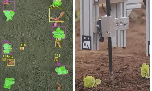 E-TERRY的机械除草模块数量可达6个,每个模块配备可更换工具头,能应对不同土壤条件与杂草压力(如坚硬土壤需用重型刀具,疏松土壤用轻型刷具)。除草过程由AI表型分析系统引导:该系统对作物的识别准确率超95%,能精准定位杂草并靶向清除,精度可达5毫米——这意味着它能区分作物与杂草的细微差异,避免误伤。