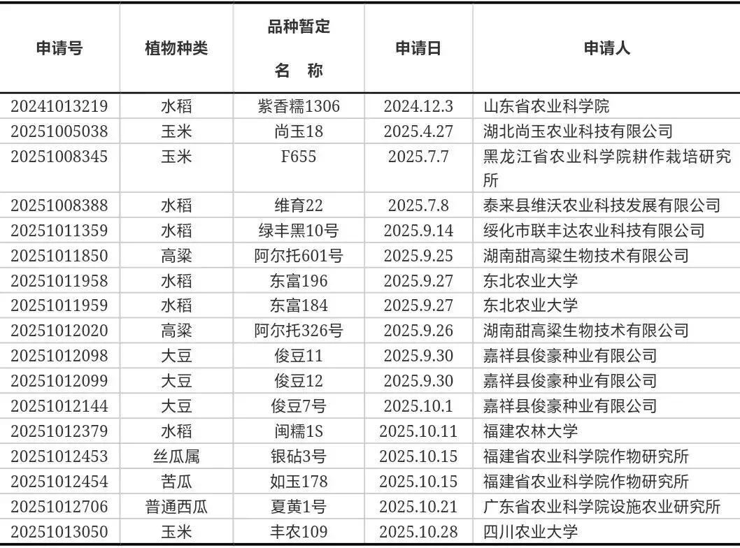 依据1997年10月1日起施行的《中华人民共和国植物新品种保护条例》第二十五条的规定,以及2025年6月1日起施行的《中华人民共和国植物新品种保护条例》第二十六条的规定,同意下列品种权申请人撤回其品种权申请。