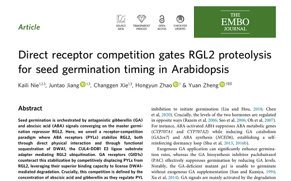 近日,西北农林科技大学未来农业研究院郑远教授团队在种子生物学研究领域再获突破,在《The EMBO Journal》上发表了题为“Direct receptor competition gates RGL2 proteolysis for seed germination timing in Arabidopsis”的研究论文。该研究首次揭示了决定种子萌发的核心抑制因子RGL2,其蛋白稳定性受赤霉素(GA)与脱落酸(ABA)激素受体直接竞争的精准调控,为植物如何感知环境、精确决策生命启动时机提供了全新范式。