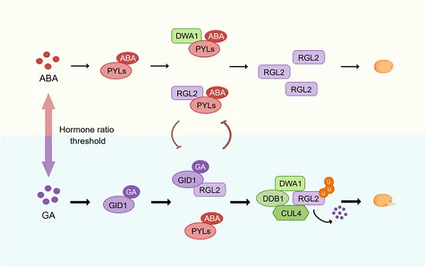 研究表明,ABA受体PYLs能够直接结合并“守护”RGL2,阻止其被降解,从而维持种子的休眠状态。相比之下,GA受体GID1s展现出更强的结合能力,当GA信号增强时,GID1s如同"强力竞争者",能够将结合在RGL2上的PYL“置换”出来。这种竞争性置换机制至关重要,因为只有当GID1s与RGL2结合后,才能促进CUL4 E3泛素复合体底物识别蛋白DWA1与RGL2的相互作用,进而启动其泛素化降解过程。RGL2一旦被清除,种子萌发的"制动系统"便被解除,生命程序随之启动。