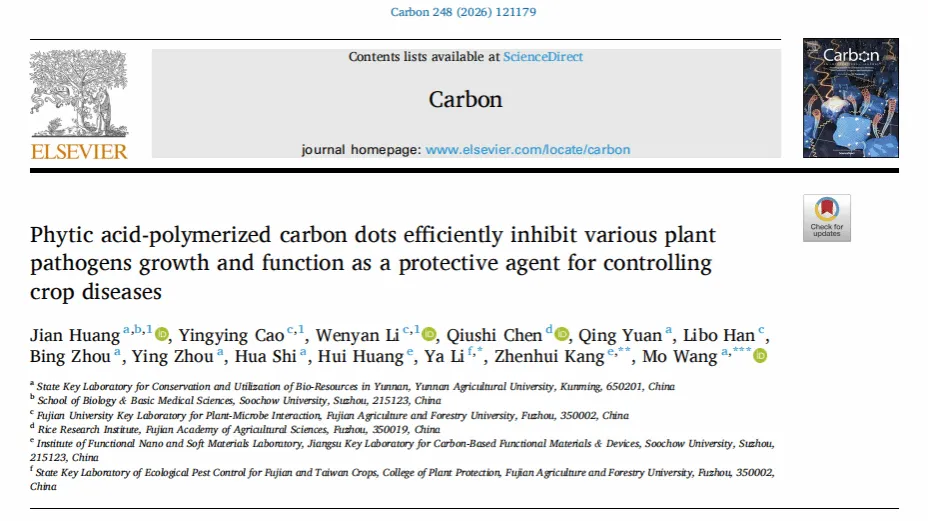 近日,云南农业大学植物保护学院王莫课题组在国际著名碳材料期刊Carbon(IF=11.6)上发表题为“Phytic acid-polymerized carbon dots efficiently inhibit various plant pathogens growth and function as a protective agent for controlling crop diseases”的学术文章,系统揭示了植酸碳点纳米材料抑制植物病原真菌和细菌的作用机理及其在作物病害防控中应用潜力。