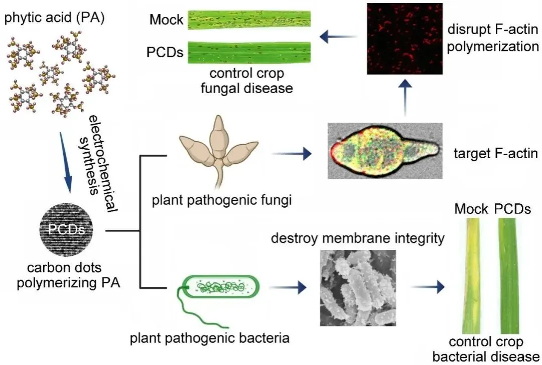 研究团队进一步发现,75μg/mL的PCDs对于各种作物病原细菌生长的抑制率近乎达到100%,而同浓度的植酸溶液的抑制率仅为20%左右。通过扫描电镜观察发现,利用75μg/mL的PCDs处理水稻白叶枯病菌24小时后,菌细胞膜出现异常褶皱;当处理到48小时后,白叶枯菌细胞表面产生外向延伸的凸起并伴随细胞膜破裂和菌细胞死亡。这些结果表明,对于植物病原细菌,PCDs通过干扰细胞膜的完整性进而发挥抑菌作用。有研究表明,结合在细菌外膜上的二价金属离子,如Mg2+,可以稳定细菌表面的脂多糖以维持其细胞膜的完整性。因此研究人员推测,PCDs在渗透进入细菌细胞过程中,对其表面金属离子的螯合作用破坏了细菌细胞膜的完整性,进而起到抑制细菌生长的作用。值得关注的是,PCDs具有较强的稳定性。利用PCDs在接种前12小时喷施处理各类作物幼苗,可有效防控水稻稻瘟病、胡麻叶斑病、白叶枯病、小麦白粉病、番茄细菌性斑点病的发生。因此,该项工作所研发的植酸碳点材料通过干扰真菌细胞骨架actin filament的聚合以及破坏细菌细胞膜的完整性,表现出广谱的抑菌活性,并可以作为一种保护型制剂应用于各类作物真菌和细菌病害的防治。