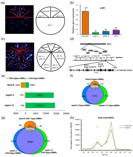 (a-b) 低荧光突变体rll7-1的遗传筛选和LUC基因表达水平分析。(c-d) rll7-1突变基因的等位性测验和图位克隆,证明了RLL7基因对应于THO2基因,rll7-1突变体因此被命名为tho2-8(e) tho2-8突变体的DNA甲基化水平分析。(f) tho2-8突变体包含的hyper-DMRsDNA甲基化突变体nrpd1-3nrpe1-11hypo-DMRs之间的重叠分析。(g) tho2-8突变体包含的CHH hypo-DMRsDNA甲基化突变体nrpd1-3nrpe1-11CHH hypo-DMRs之间的重叠分析。(h) tho2-8突变体中的不同尺寸的small RNA的总体丰度检测。