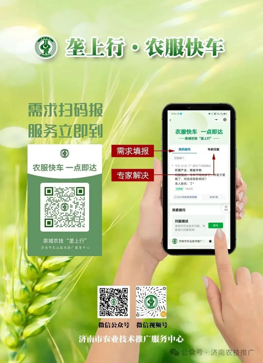 济南市农业技术推广服务中心履行公益性职责,聚焦乡村产业发展,整合经验丰富的农技干部、农业领域专家,联动深耕乡土的“土专家”“田秀才”,共同组成15支服务团队,深入园区基地、走进田间地头送技术、送服务、送信息。如果您在农业生产中遇到难题,可联系相应团队,也可通过济南农技推广微信公众号“农服快车”提问,相关专家将第一时间为您解答。