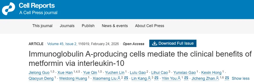 近日,中国农业大学食品学院游义琳/战吉宬教授团队在Nature Communications期刊上发表题为“Interleukin-10 expressing B lineage cells in visceral adipose tissue protect against aging-related insulin resistance and extend lifespan”的研究成果,该研究综合运用人群样本分析、基因编辑小鼠模型、细胞移植、脂肪组织原位干预等多种方法,首次证实并解析了B-10细胞作为抗衰老新靶点的功能与调控机制。该研究不仅首次阐明了B-10细胞在抵抗衰老中的作用,揭示了一种脂肪免疫微环境在衰老调控中的新机制,也为干预衰老相关代谢性疾病提供了潜在靶点。通过靶向增强B-10细胞功能或调控BAFF信号,未来有望开发出促进代谢健康、延缓衰老进程的新型治疗策略,尤其在应对全球老龄化背景下具有重要意义。中国农业大学游义琳副教授、战吉宬教授、河南医药大学刘晓萌教授、北京医院韩雪助理研究员为该论文的共同通讯作者。中国农业大学博士生、北京大学博士后郭杰龙和韩雪助理研究员为本文共同第一作者。近日,中国农业大学食品学院战吉宬/游义琳教授团队在Cell Reports期刊上发表题为“Immunoglobulin A-producing cells mediate the clinical benefits of metformin via interleukin-10”的研究成果,揭示MTF通过促进肠道免疫球蛋白A(IgA)抗体分泌细胞(ASC)的增殖和易位,从而改善胰岛素敏感性。该研究不仅阐明了二甲双胍依赖肠道‒免疫‒代谢轴发挥疗效的新机制,也为糖尿病个体化治疗提供了新视角。研究提示,二甲双胍的疗效与其对肠道微生物的调节及诱导的肠道IgA反应强度相关,这或许可解释部分患者对药物反应不佳的现象。未来可通过调控肠道菌群或靶向增强IgA‒IL-10免疫轴,优化二甲双胍的治疗效果,甚至为开发新型代谢性疾病免疫调节策略提供理论依据。中国农业大学战吉宬、游义琳,河北省平山县人民医院康琳,新乡医学院刘晓萌为该论文的共同通讯作者。中国农业大学已毕业博士生郭杰龙、韩雪、秦岳为本文共同第一作者。