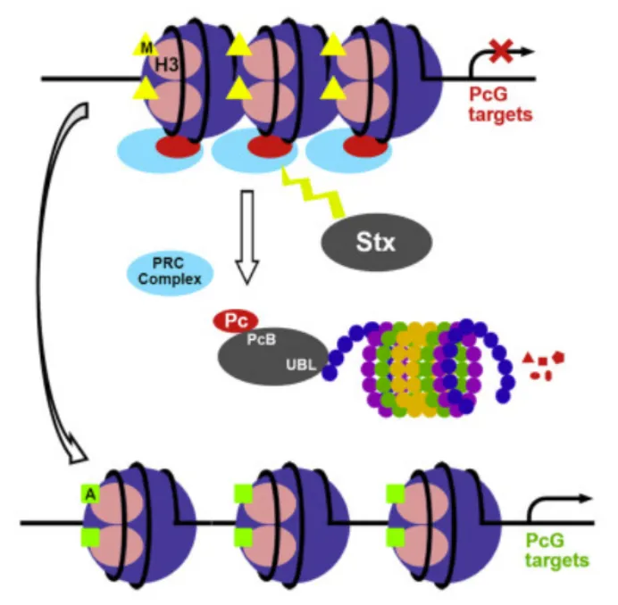 在2016年,杜娟等与合作导师在Developmental Cell发表研究,首次揭示了Stx蛋白在发育中的关键作用。研究人员发现Stx能通过不依赖于泛素的蛋白酶体降解途径特异性清除Polycomb(Pc)蛋白,进而调控Pc复合物的活性,影响基因表达和发育进程,这确立了Stx作为表观遗传调控关键蛋白的“分子开关”角色。