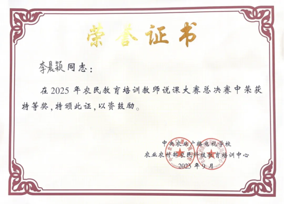 学校紧扣农业农村现代化发展目标和省市新农人培育三年行动计划要求,着力擦亮“智慧农业建设领跑者”名片,全链条打造乡村振兴“生力军”。学校构建教师教学能力“研、学、赛、评、建”五维一体的发展路径,2025年,园林工程学院李晨颖老师在全国农民教育培训教师说课大赛总决赛中,凭借《三步走:打造乡村网红民宿》作品,从全国33个地区的755名参赛选手中脱颖而出,以卓越的教学设计和现场表现,为学校再次斩获特等奖,充分彰显了在涉农教育领域的深厚积淀以及在服务乡村振兴战略中的坚定担当。